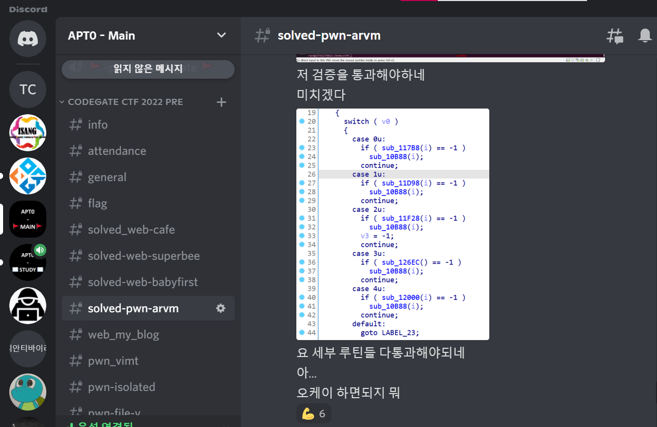 팀원들과 디스코드 채널을 통해 생사를 확인하며 문제를 풀었는데, 거의 전우애가 느껴졌다.