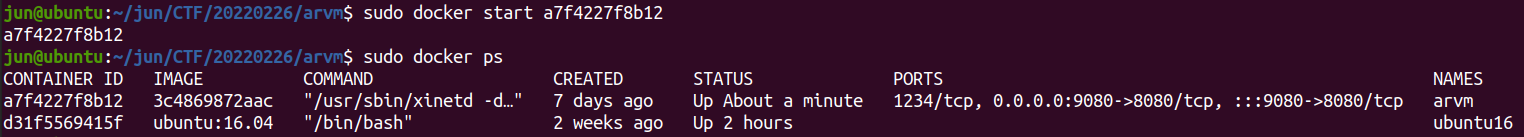 jun@ubuntu:~/jun/CTF/20220226/arvm$ sudo docker run -i -t -d -p 9080:8080 --name arvm 3c4869872aac