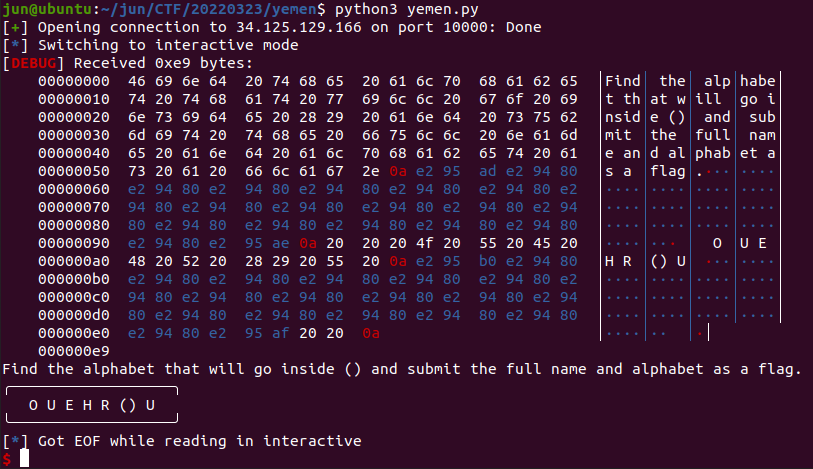 p = remote 로 연결하고 p.interactive()로 바로 붙어보니까, 바로 EOF를 만난다.