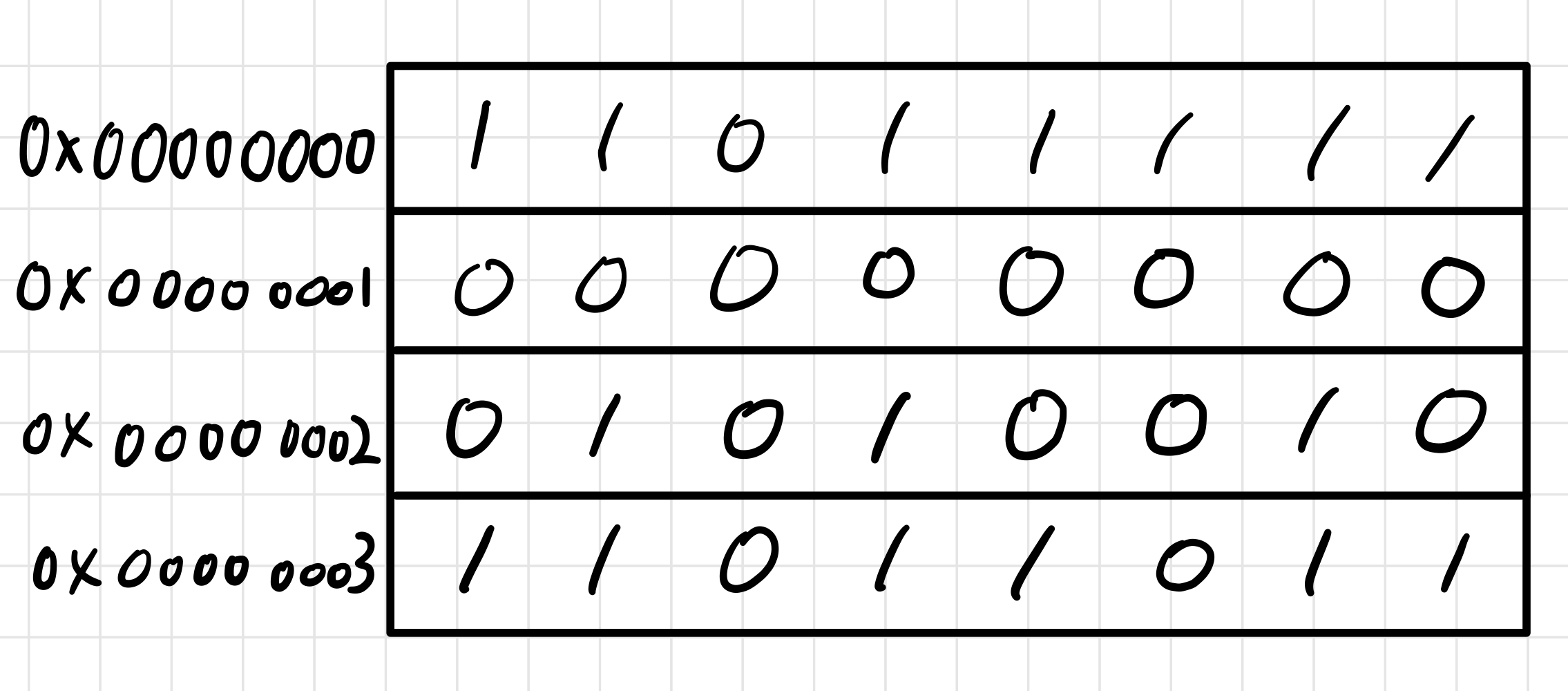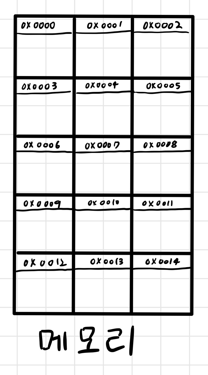 주소 한 칸당 1byte의 데이터가 들어가고, 1byte는 이내 곧 8비트이니까 실제 메모리는 다음과 같은 모습이겠다.