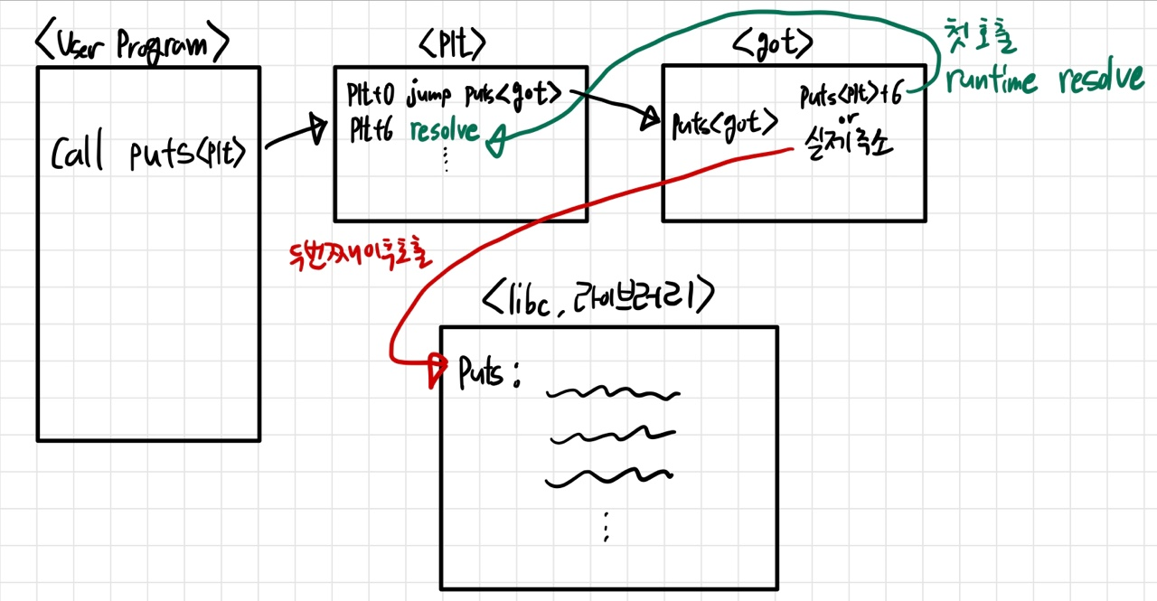 4. (처음 호출) got에 puts<plt>+6 주소가 있음 -> puts+<plt>+6으로 점프 -> runtime resolve (호출 & GOT에 기록)
