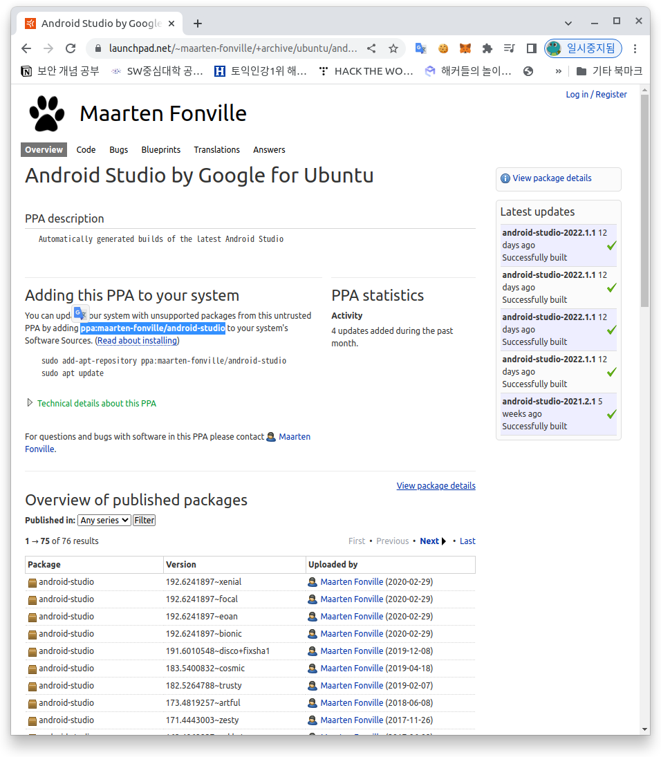 다음과 같이 ppa:maarten-fonville/android-stdio 라는 이름의 PPA 저장소가 있는 것을 확인해볼 수 있다.