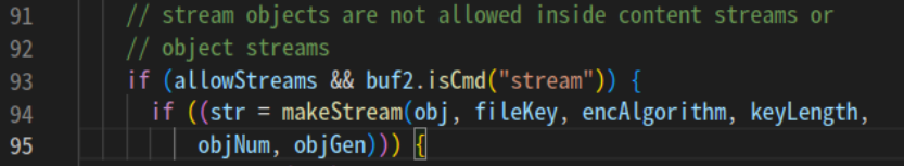 #52650 0x00005555555fde39 in Parser::makeStream (this=0x555555bfd2b0, dict=0x7fffffd5cdc0, fileKey=0x0, encAlgorithm=cryptRC4, keyLength=0, objNum=7, objGen=0) at Parser.cc:156