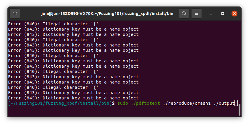 sudo afl-fuzz -i $HOME/Fuzzing101/fuzzing_xpdf/pdf_examples/ -o $HOME/Fuzzing101/fuzzing_xpdf/out3/ -s 123 $HOME/Fuzzing101/fuzzing_xpdf/install/bin/pdftotext @@