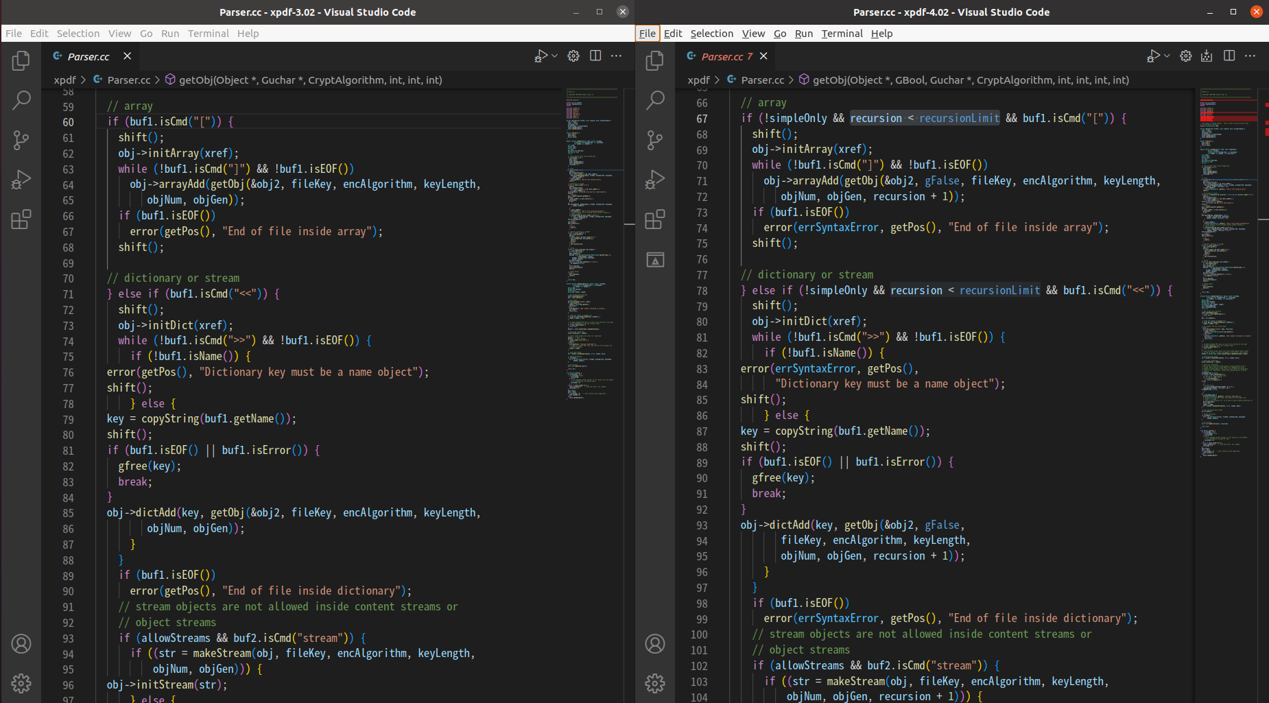 구체적으로 해당 프로그램의 Parser::getObj 에서 recusion이 발생했으며 자세한 내용은 아래에 있다.