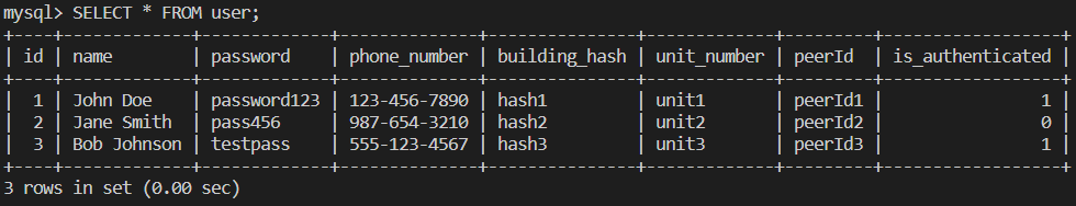 INSERT INTO user (name, password, phone_number, building_hash, unit_number, peerId, is_authenticated)