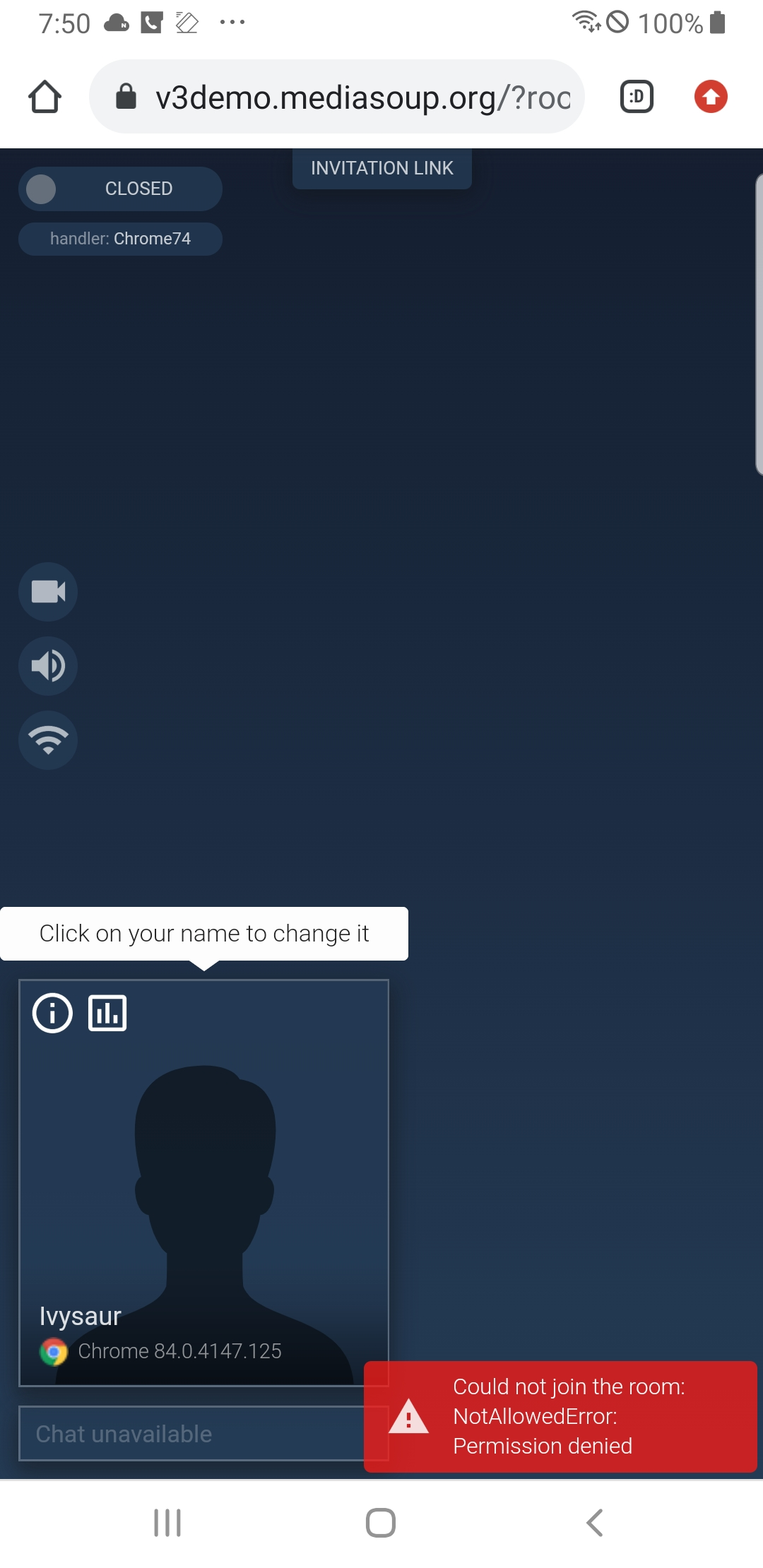 Could not join the room: NotAllowedError: Permission denied가 뜨며 접속이 안되는 경우가 있다.
