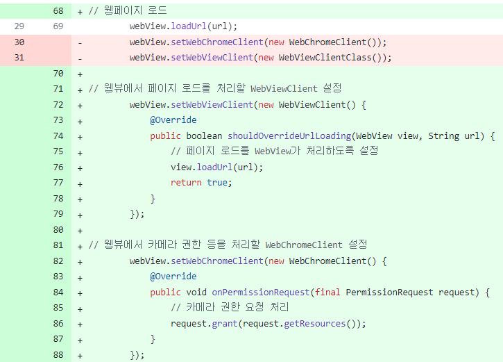// 웹뷰에서 카메라 권한 등을 처리할 WebChromeClient 설정