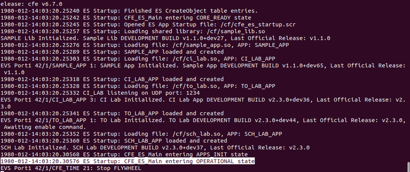 startup 메시지랑 CFE_ES_Main 이 OPERATIONAL state에 돌입하는 것을 확인할 수 있다.