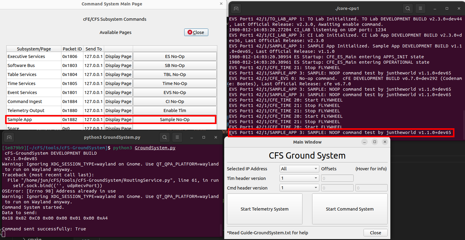 cFS-GroundSystem tool을 이용해서 commands를 보내거나 telemetry를 받을 수 있다.