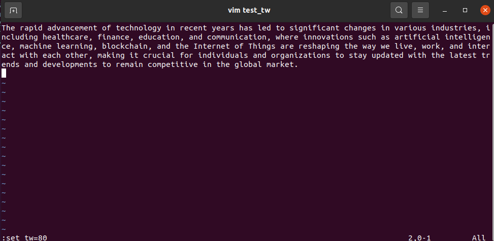이후 esc -> :set tw=80(원하는 textwidth) 을 입력해 원하는 너비를 세팅해준다.