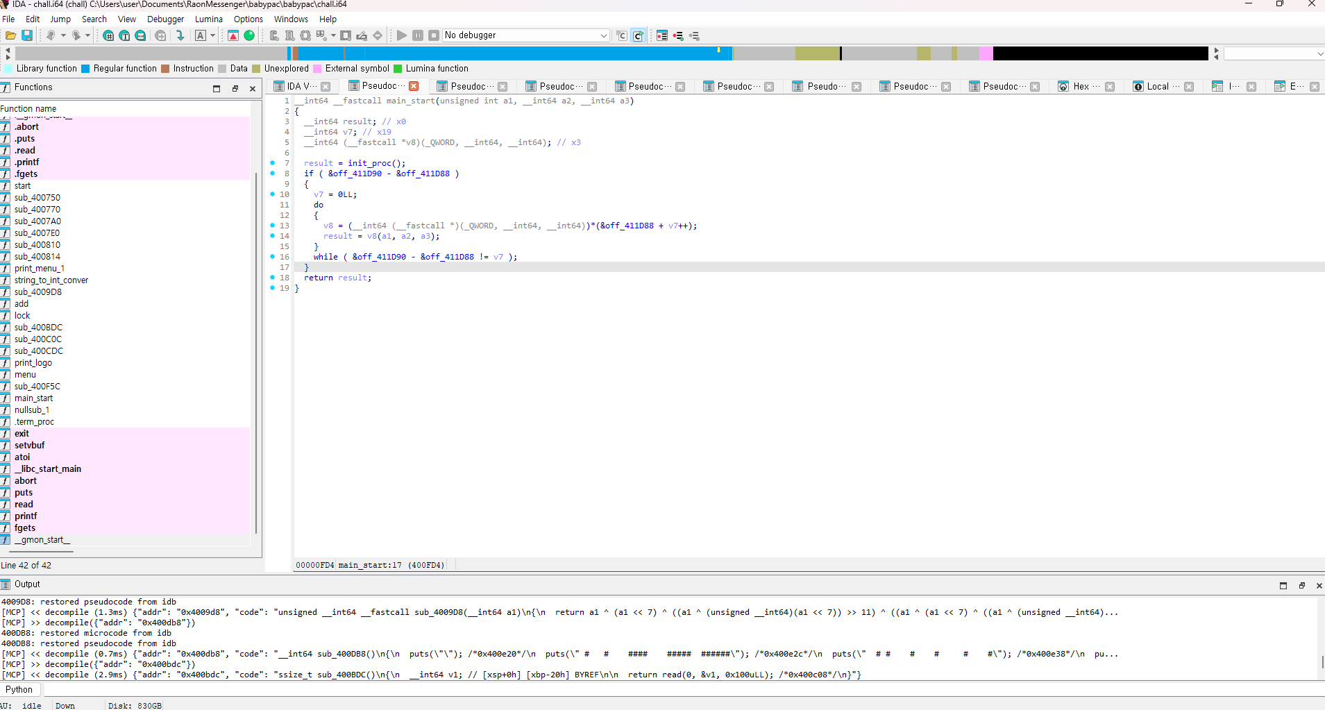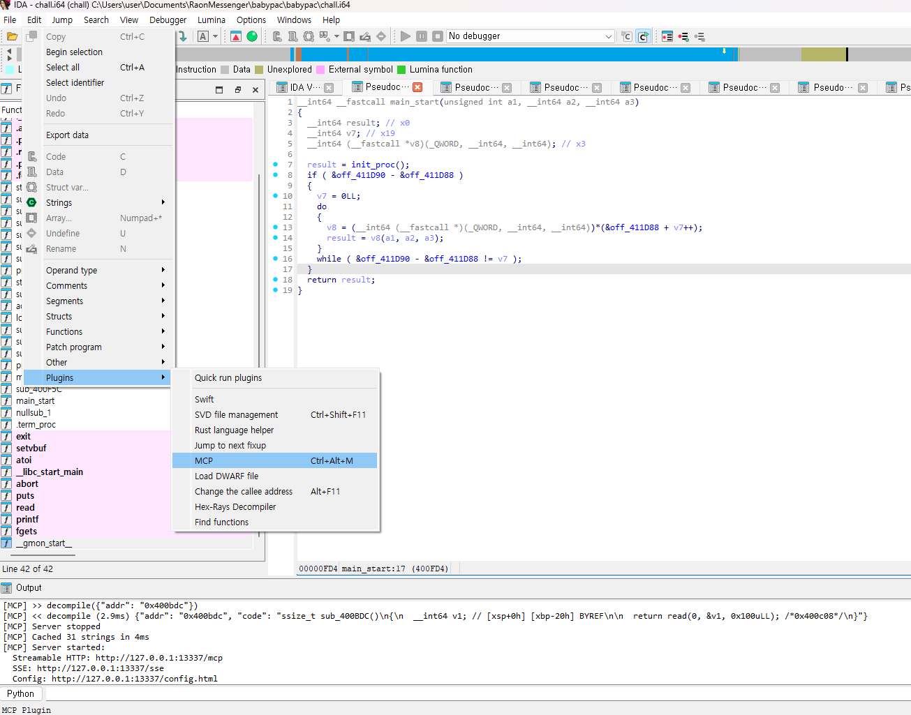 - ida-pro-mcp 설치 후 파이썬 연결 잘 되어야 ida pro Edit->Plugins->MCP에 뜬다(IDA Pro 재부팅 해줘야되고 좀 시간 걸리긴한다)