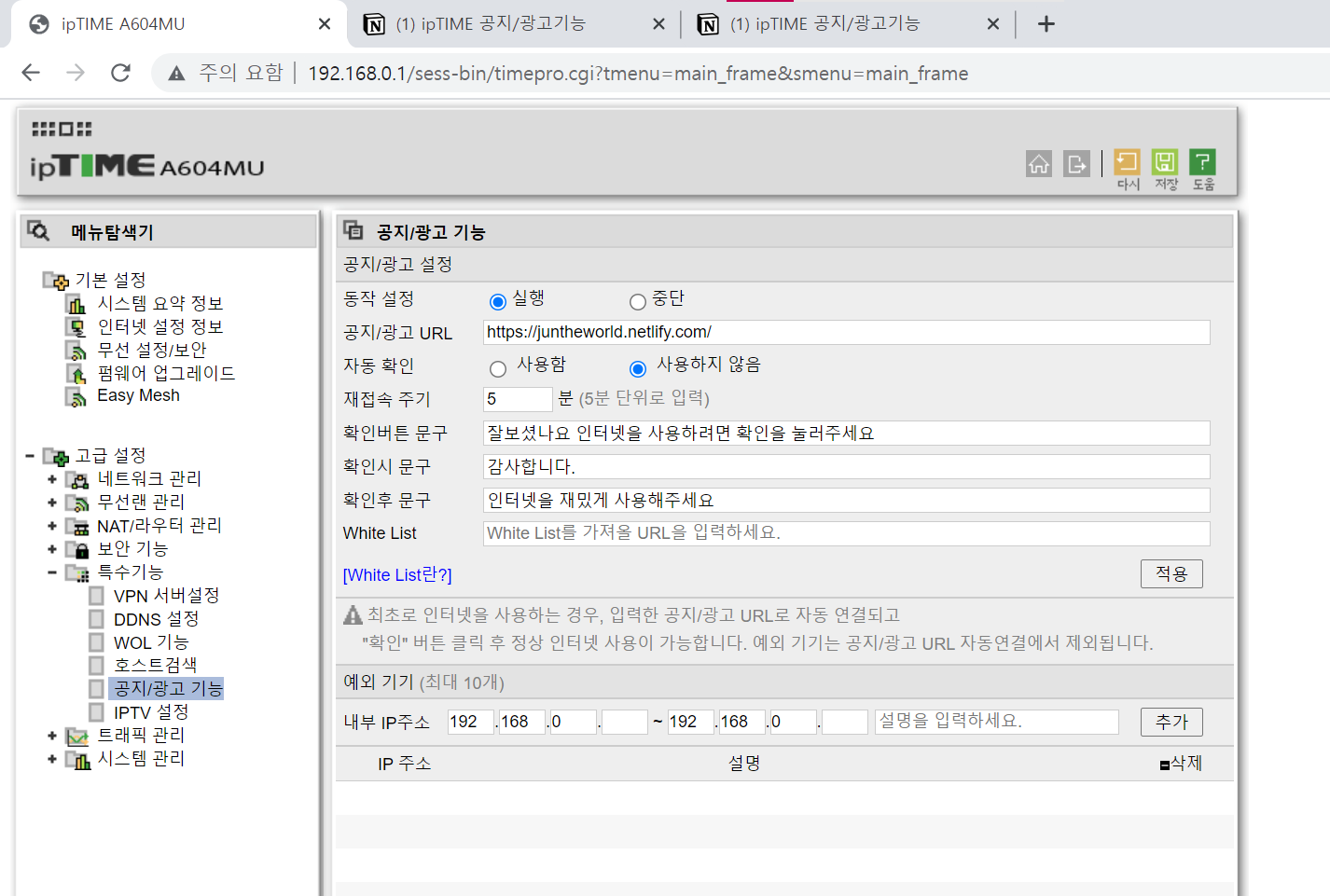 오늘은 ipTIME 사용자 설정 창에 있는 공지/광고 기능을 사용해보았다.