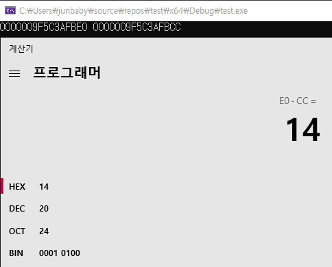 가 나와서 주소 값의 차이는 0x14 (십진수 20)이 나온다!!