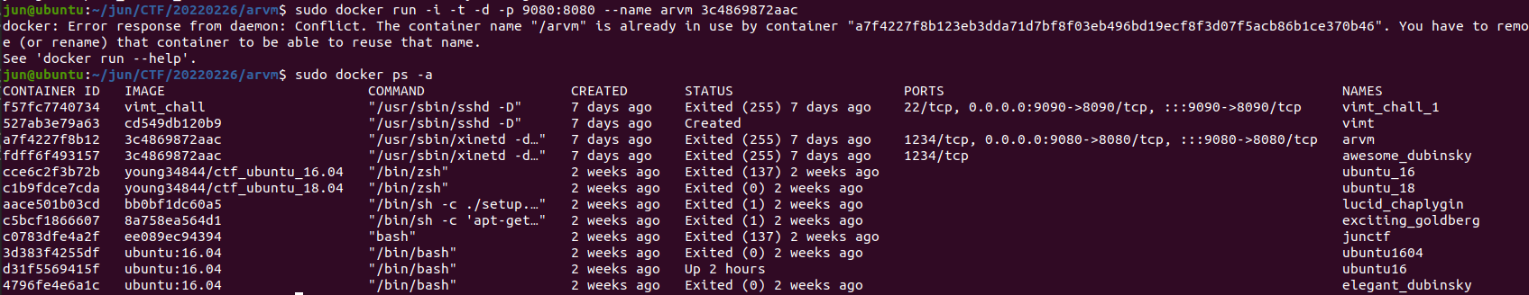 sudo docker run -i -t -d -p 9080:8080 --name arvm 3c4869872aac